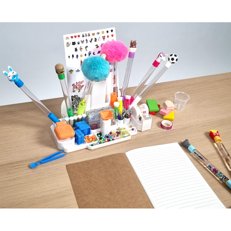 Conține: 7 pixuri, 21 rezerve de cerneală care se sterge (7 culori diferite), 2 carioci textmarker, 3 creioane, 1 caiet A5, 4 role de bandă adeziva, 1 foaie de autocolante,argilă in 5 culori pentru guma de șters, 3 matrițe pentru confecționarea gumelor de șters, 7 figurine, 1 cutie de paiete, 2 pompoane mari, 1 cutie cu decoratiuni, 5 tuburi cu margelute, 3 pompoane mici, margele, un set de cleste/ lingurita, 1 palnie, instructiuni ilustrate