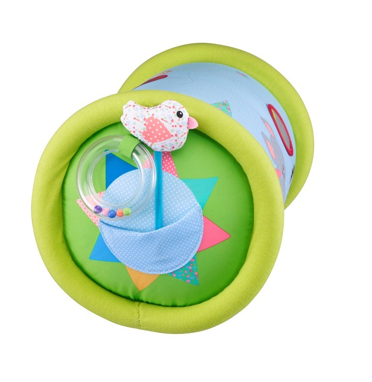 Jucaria Rollin’ are mai multe fatete cu urmatoarele activitati pentru stimularea simturilor copilasului: oglinda, bilute sonore, hartie fosnitoare, inel texturat de dentitie. Jucaria este foarte usoara ca greutate (fiind gonflabila) si simplu de transportat.