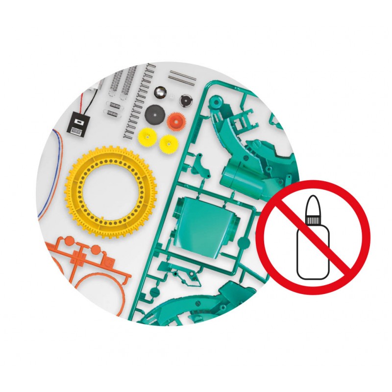 Include: 1 roată dințată tip pignon, 1 roată dințată neagră, 1 roată dințată galbenă, 1 roată dințată portocalie, 1 roată dințată neagră mică, 1 ax, șurub autofiletant, 1 arc (mic), 1 arc (mare), 1 bilă de oțel, 1 capac, 1 suport pentru baterii cu conector, 1 motor cu placă de circuit imprimat, piese detașabile, 1 foaie ilustrată.