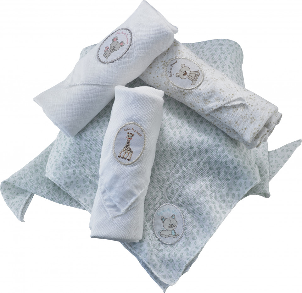 Perfect pentru nou-nascuti, atat acasa cat si la plimbare. Acest frumos set de 4 scutece brodate cu imaginea lui Sophie la girafe si a prietenilor ei este realizat dintr-un material moale, respirabil si durabil, care multumeste deopotriva atat mamicile cat si bebelusii. Ideal ca protectie atunci cand alaptati sau pentru a va proteja impotriva refluxului cand tineti copilul pe umar. Acest accesoriu este esential pentru copii, scutecele Sophie la girafe mai pot fi folosite ca si: - protectie pentru carucior - protectie pentru masa de infasat - baveta - paturica