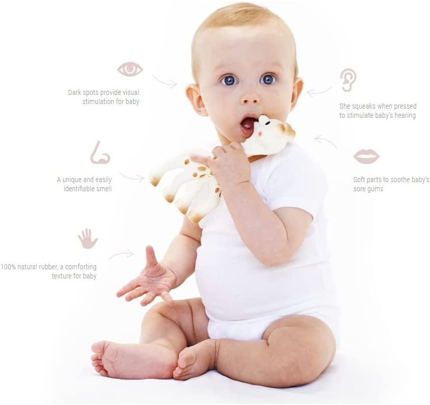 - Mirosul: mirosul aparte al cauciucului extras din arborele de Hevea o face pe Sophie sa fie usor de recunoscut de catre bebelus dintre toate jucariile sale.