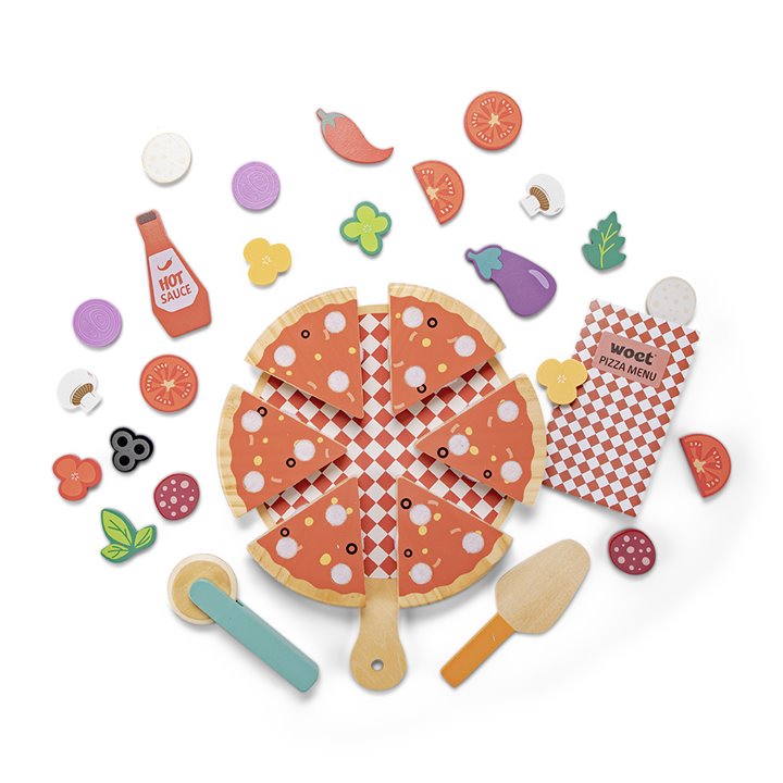 Setul include o bază de pizza din lemn împărțită în șase felii, 21 de toppinguri combinabile care se atașează la bază cu elemente de fixare tip arici și toate elementele esențiale pentru jocul de rol: o placă de servire, un tăietor de pizza, un servet de pizza, o sticlă de sos iute și un meniu ilustrat. De la salam picant la busuioc proaspăt și tot ce se află între ele, cei mici își pot combina toppingurile preferate pentru a crea pizza visurilor lor. De asemenea, pot recrea combinațiile delicioase prezentate în meniul ilustrat, dezvoltându-și în același timp abilitățile motorii fine, interacțiunea socială și creativitatea prin joacă. Un favorit distractiv și aromat pentru fiecare bucătărie de jucărie - Poftă bună! Această jucărie este fabricată din lemn certificat 100% FSC®.