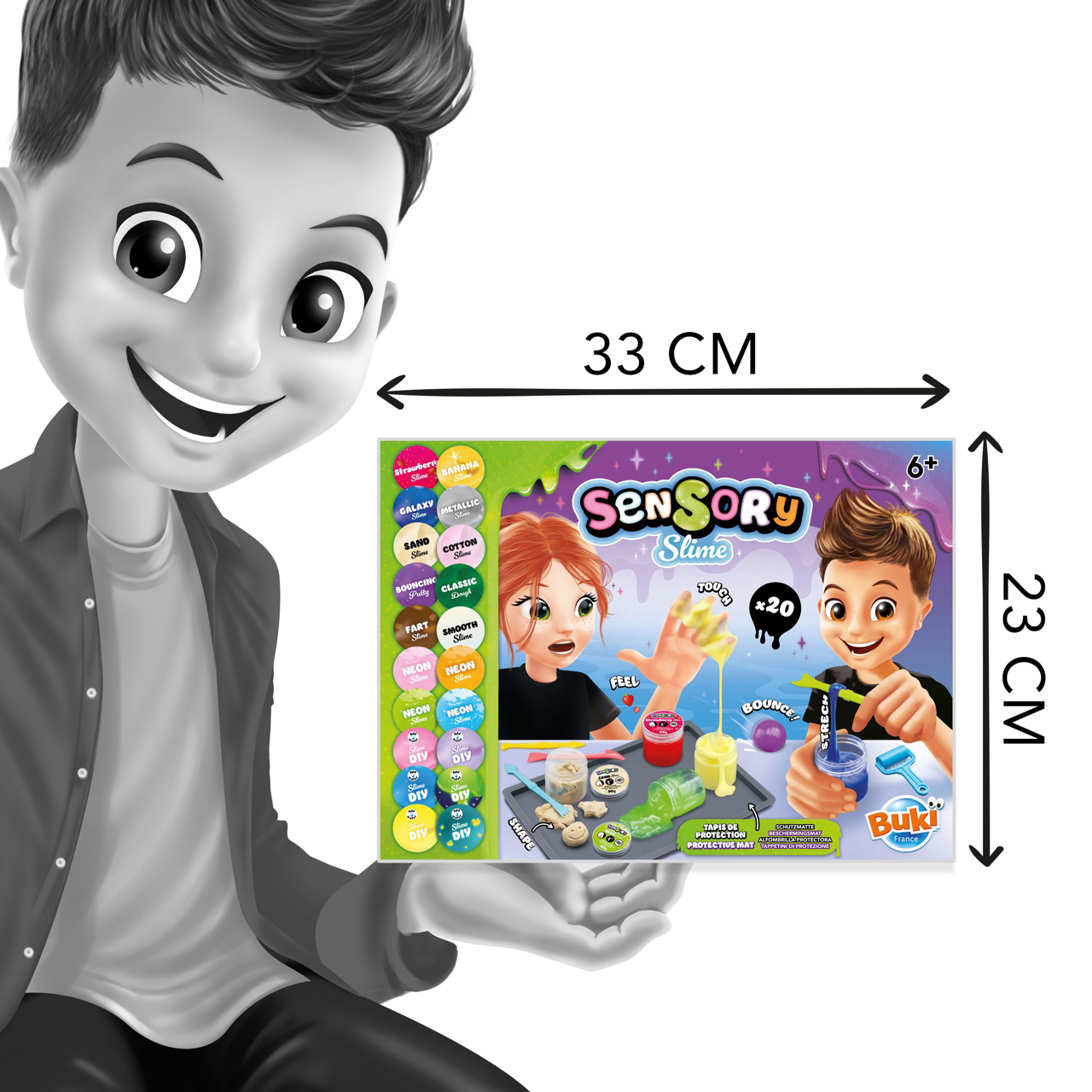 Descoperiti cele 20 de tipuri de slime din recipientele incluse in set: slime saritor, stralucitor, neon, cu aspect de bumbac, metalic etc. Creati amestecuri adaugand apa in paharele gradate. Folositi instrumentele pentru a modela, framanta si a amesteca slime urile. Setul include un covoras de silicon pentru a proteja masa de lucru.