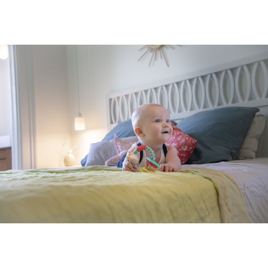 Culorile vii atrag privirea bebelusului, materialele cu texturi diferite, moi sau mai dure, sunt potrivite pentru a masa gingiile dureroase ale bebelusului. Patru forme geometrice diferite si bilutele din interiorul inelului gingival zornaie atunci cand bebelusul le agita. Usor de tinut in manuta, datorita formei speciale. Produsul este ambalat intr-o cutie de carton.