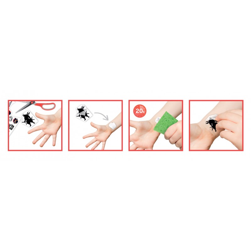 Avertisment: Nu aplicati in jurul ochilor. Posibile reactii cutanate; daca observati reactii adverse ca roseata la nivelul pielii sau alte reactii, indepartati imediat tatuajul. Pastrati instructiunile pentru referinte viitoare. Culorile si continutul pot varia usor.