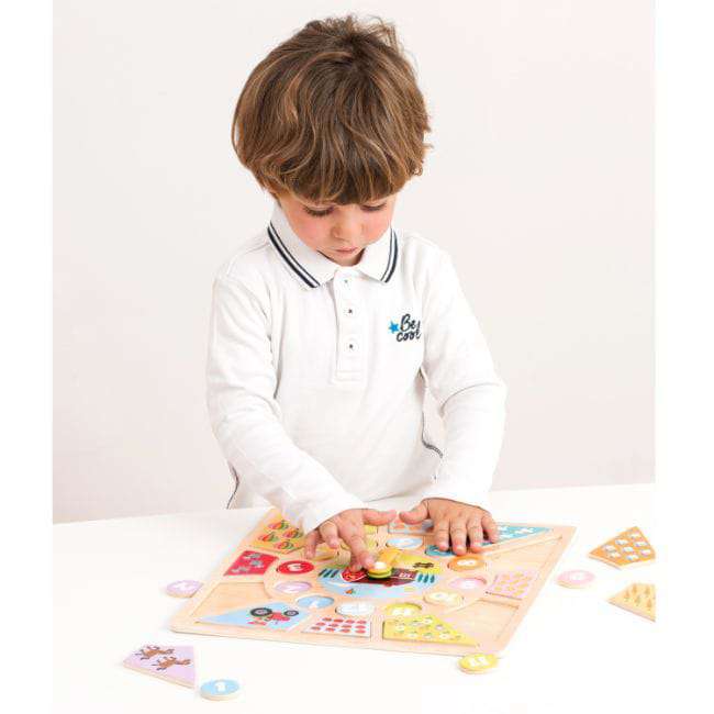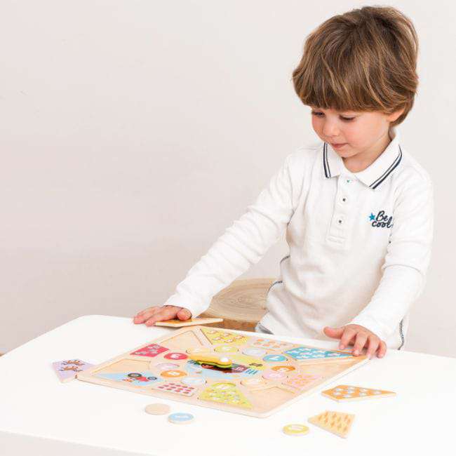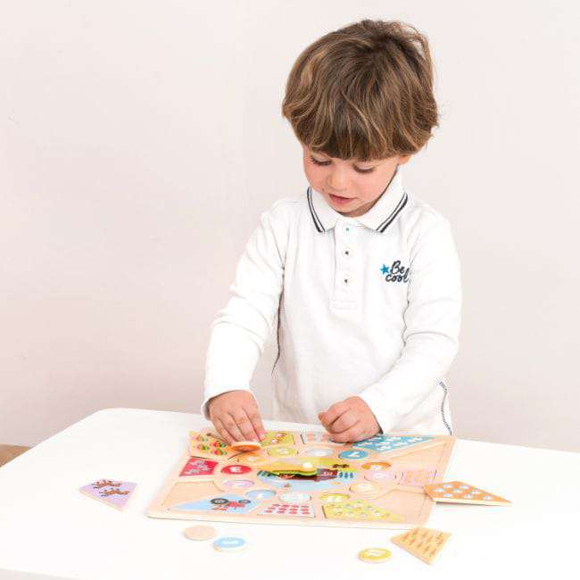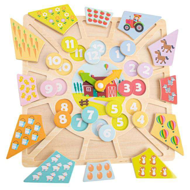 Cu o mulțime de informații, aceasta jucărie este perfectă pentru a ajuta copiii sa invete sa raspunda la intrebarea "Cat este ceasul?". Așeaza numerele de la 1 pana la 12 la locul potrivit pentru a finaliza ceasul. Apoi numără elementele frumos colorate de pe celelalte 12 piese pentru a afla de unde apartine fiecare pe acest ceas puzzle.