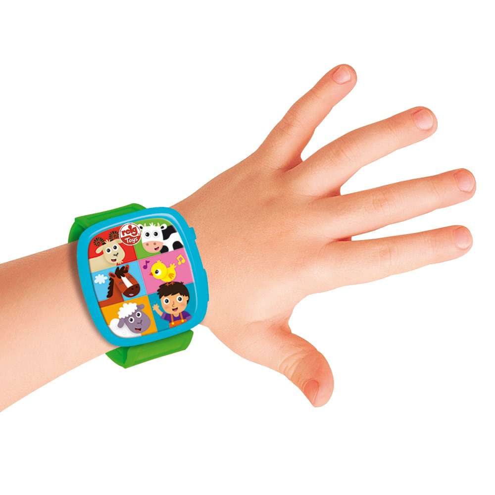 Ceas de jucarie pentru copii cu 12 melodii, 5 sunete ale unor animale cunoscute si lumini care se aprind in ton cu melodia.