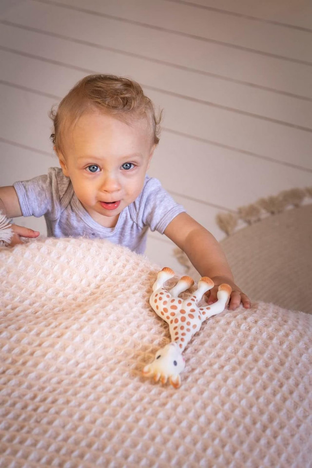 - Simtul tactil: foarte usoara, girafa Sophie este perfect adaptata manutelor mici ale bebelusului, iar picioarele sale lungi si gatul o fac usor de apucat. Fina la atingere, ca si pielea mamei, girafa are efecte linistitoare asupra bebelusului.