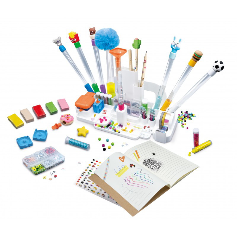 Conține: 7 pixuri, 21 rezerve de cerneală care se sterge (7 culori diferite), 2 carioci textmarker, 3 creioane, 1 caiet A5, 4 role de bandă adeziva, 1 foaie de autocolante,argilă in 5 culori pentru guma de șters, 3 matrițe pentru confecționarea gumelor de șters, 7 figurine, 1 cutie de paiete, 2 pompoane mari, 1 cutie cu decoratiuni, 5 tuburi cu margelute, 3 pompoane mici, margele, un set de cleste/ lingurita, 1 palnie, instructiuni ilustrate