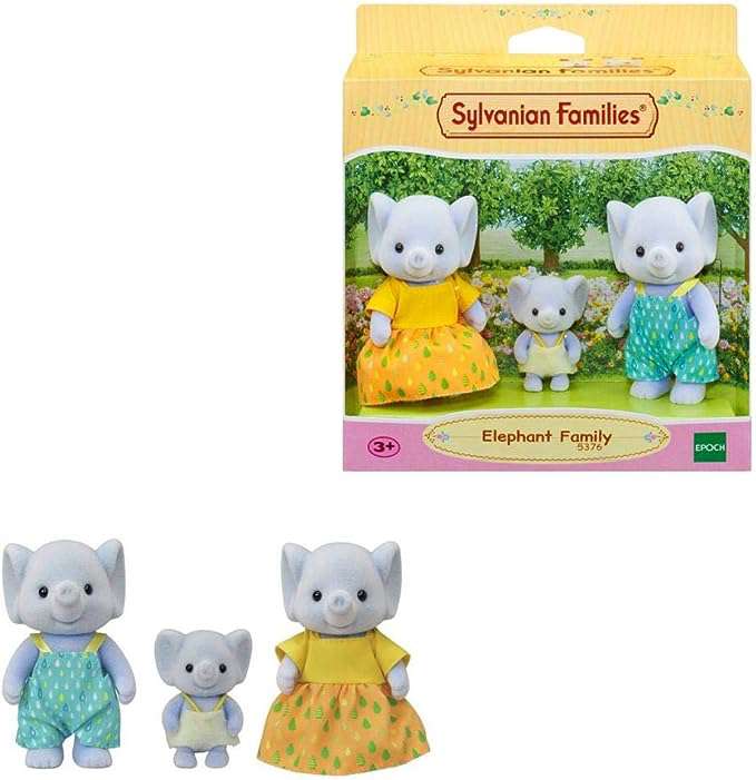Setul de Figurine Sylvanian Families - Familia Elefanteilor este format din cele trei personaje: tata elefant Mitchell, mama elefant Rianne si Hilton, baiatul elefant.