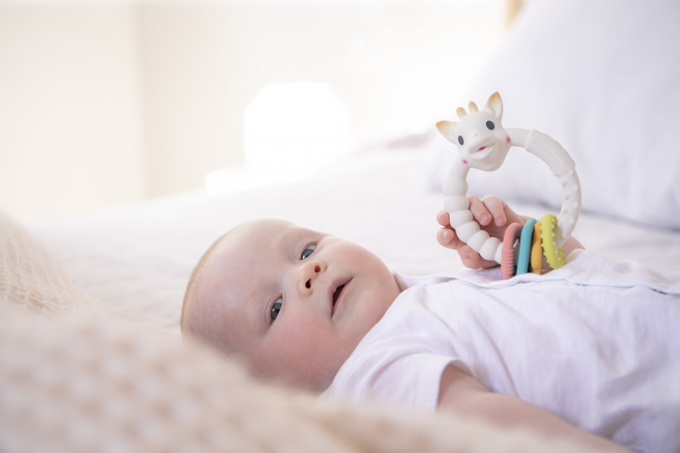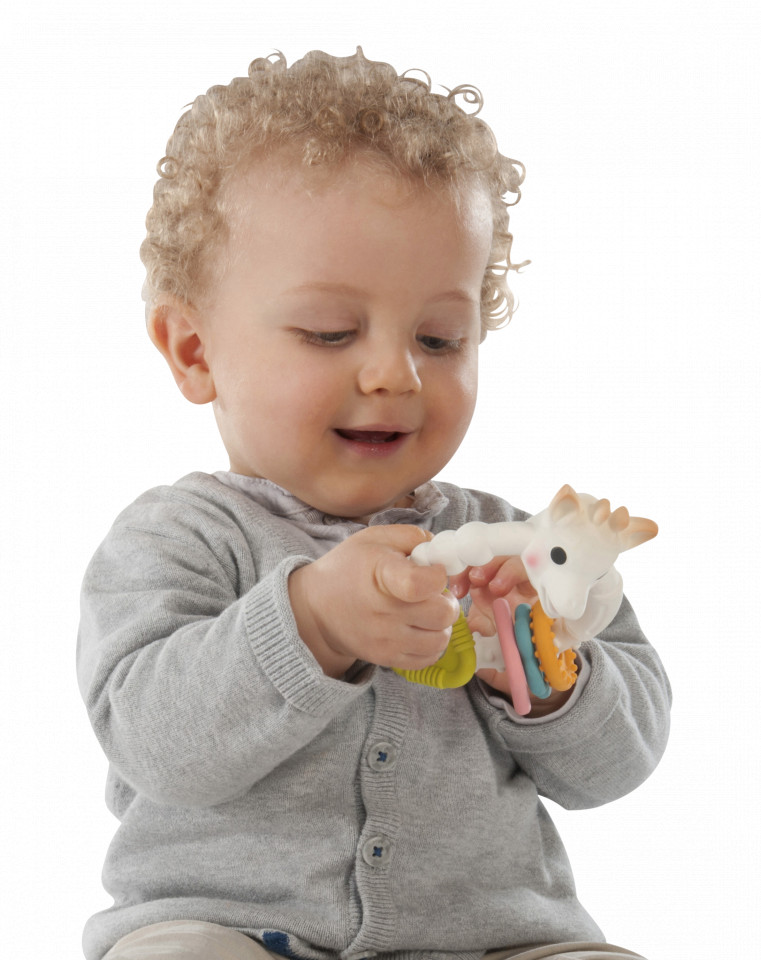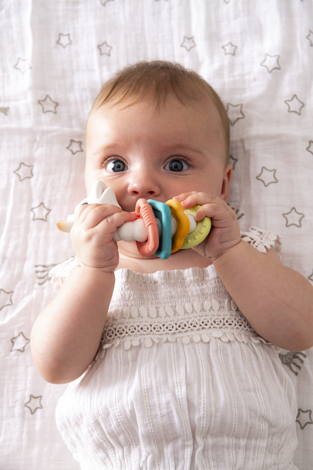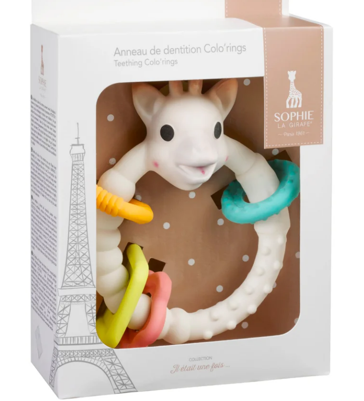 Inelul de dentitie Colo'rings este fabricat din cauciuc 100% natural, extras din arborele de Hevea. Culorile utilizate sunt de origine alimentara. Numeroasele texturi il vor ajuta pe bebelus sa isi calmeze durerile gingivale. Pe inel sunt exista 4 forme geometrice colorate diferit. Inelul este foarte usor si ergonomic, bebelusul putandu-l manevra cu usurinta. Produsul este ambalat intr-o cutie din carton cu fereastra.