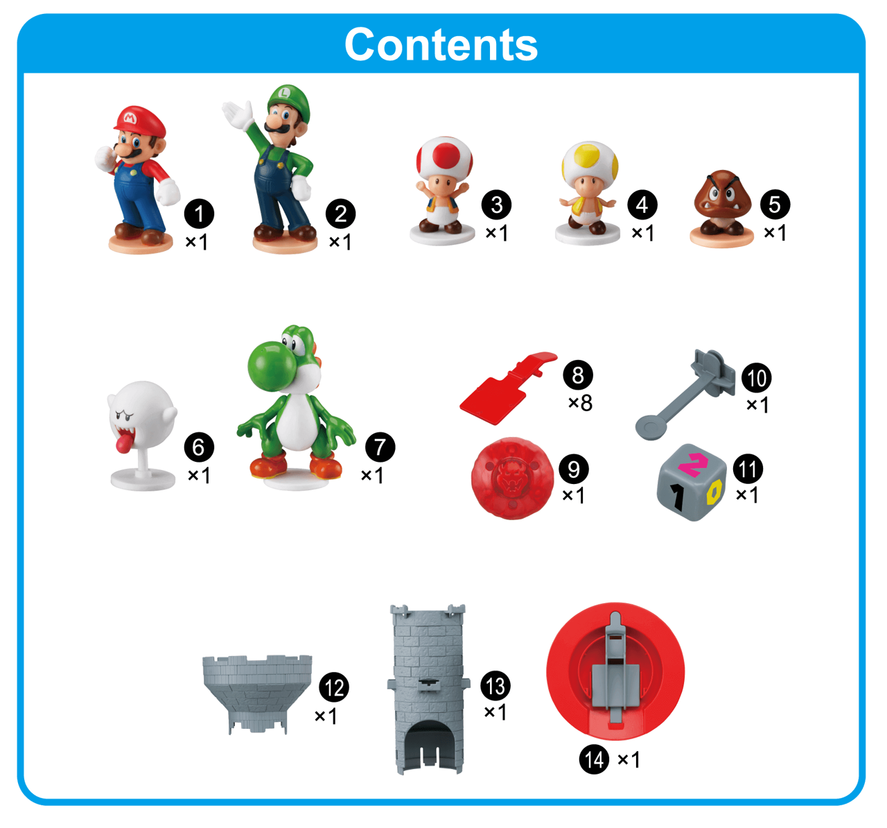 Jocul contine: 7 figurine personaje Super Mario, un turn , o minge, un zar.