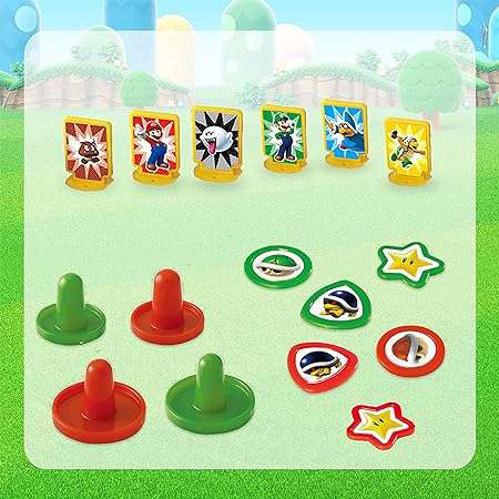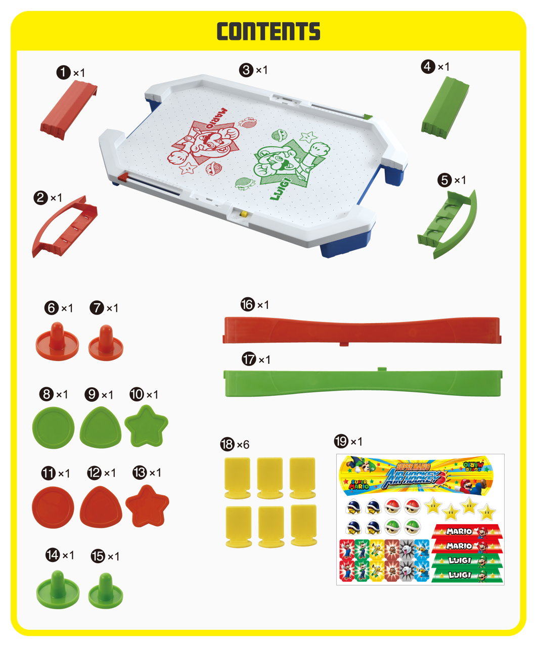 Jocul contine: 6 suporturi cu figurine Super Mario, 6 pucuri in forme si culori diferite, 4 impingatoare (2 roșii, 2 verzi).