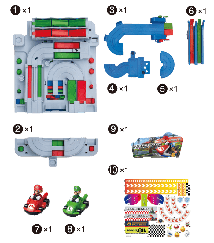 Jocul contine: o pista pentru masini, doua masinute cu figurinele Mario si Luigi.