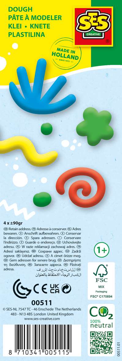 Plastilina pentru modelat, in 4 culori vesele! Plastilina este moale, complet vegana, fara gluten, super lavabila. Culorile sunt luminoase. Ambalajul resigilabil va mentine pasta moale mai mult timp. Ati terminat de modelat plastilina? Scanati codul QR de pe ambalaj si aflati ce puteti face cu recipientele!