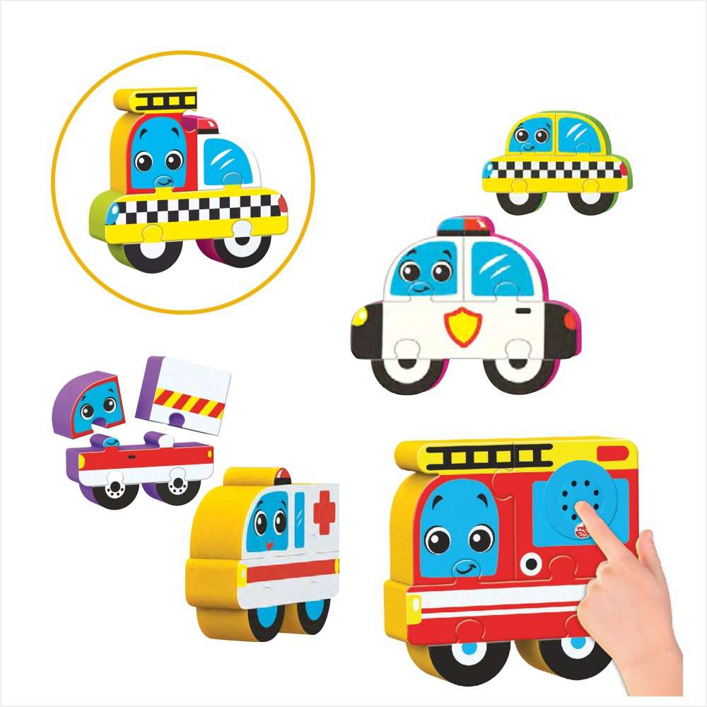 Asamblati cele 5 vehicule 3D cu ajutorul pieselor de puzzle. Setul contine 25 blocuri din spuma moale EVA. Cei mici se vor amuza ascultand cele 10 melodii si sunete ale unor vehicule usor de recunoscut.