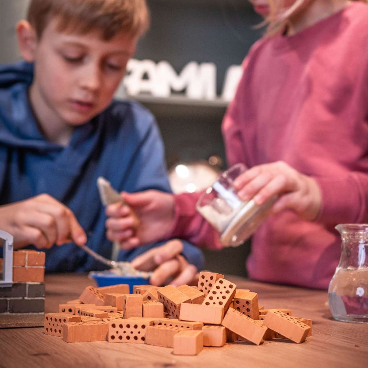 O mistrie in miniatura, un bol de mortar si placa de baza sunt incluse in pachet. Amestecul special de mortar din nisip si extract de porumb este solubil in apa si este inofensiv pentru sanatate. Nu pateaza hainele sau mobilierul si se curata foarte usor. Caramizile, fabricate din argila, sunt arse, ca si cele adevarate, la 1.000 °C. Ele pot fi refolosite la alte constructii dupa ce le-ati spalat cu apa, iar mortar se poate comanda si separat dupa ce l-ati terminat pe cel inclus in pachet.