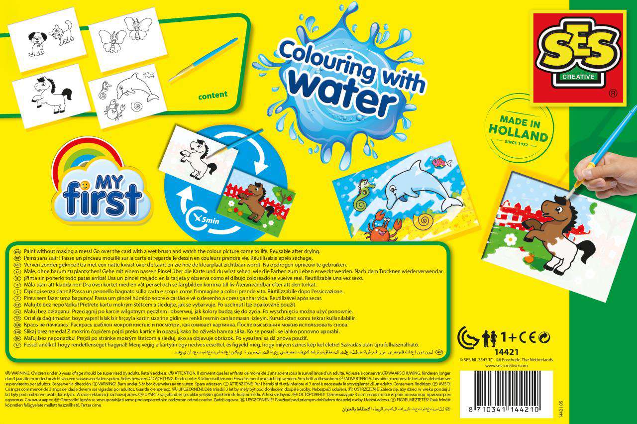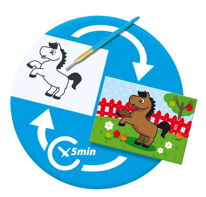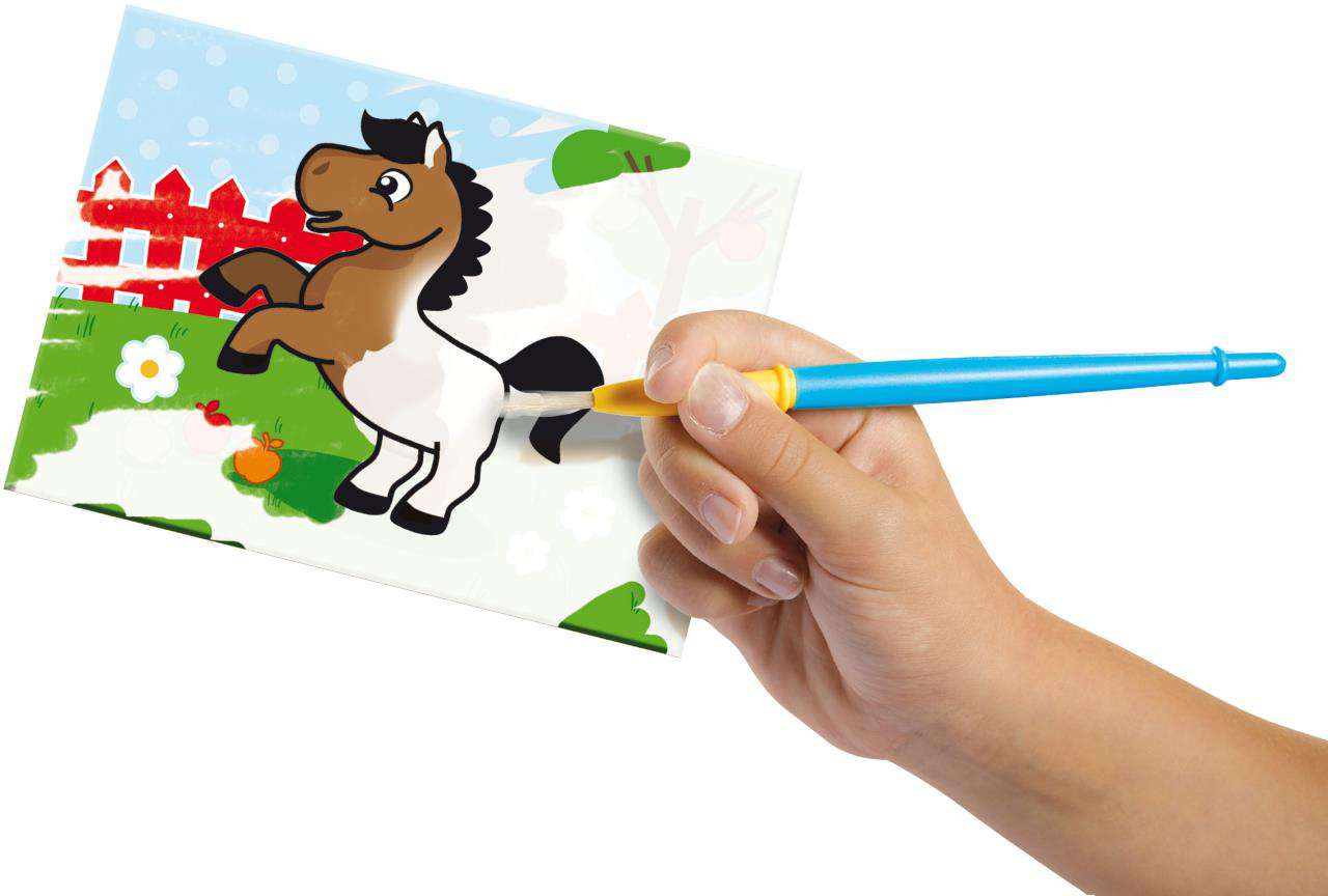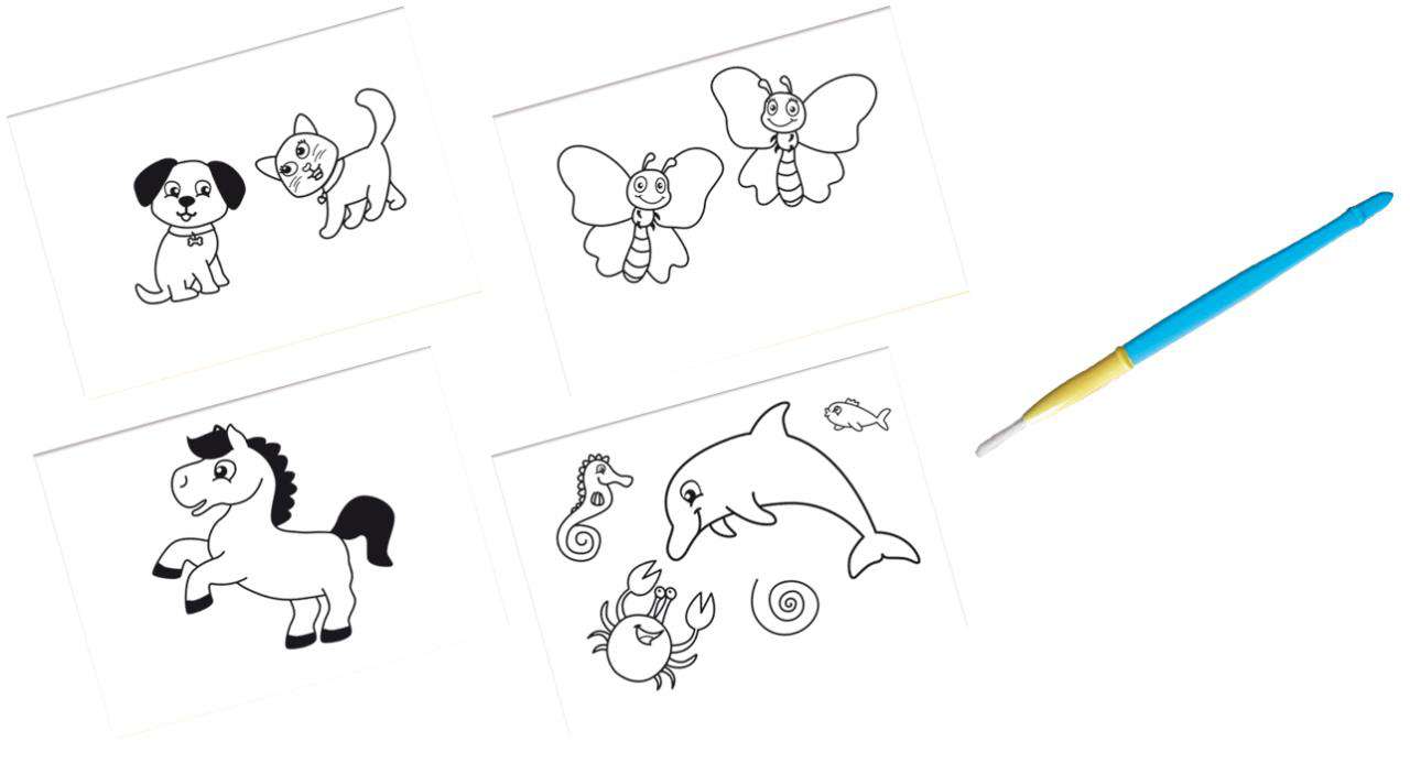 Vopsește cele 4 cartonase cu o pensulă umedă și vezi cum ilustrațiile cu animale prind viață.