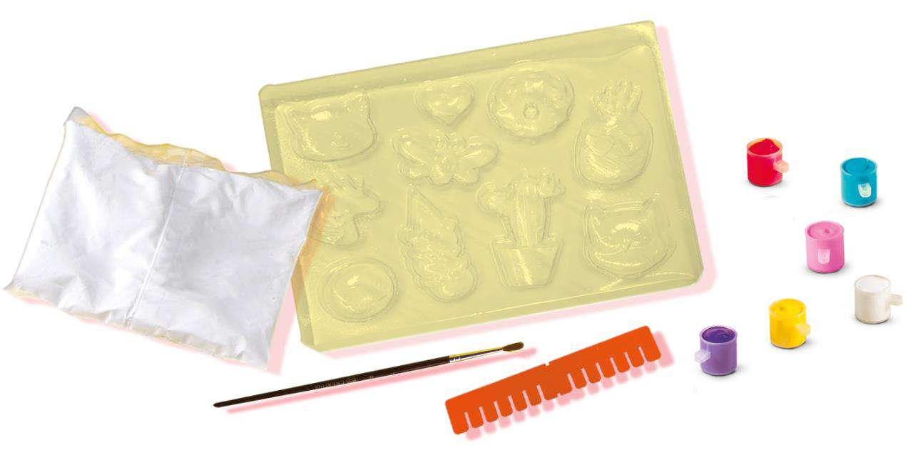 Setul include: 1 x Tavă pentru turnarea ipososului in forme, 6 x recipiente de vopsea, 1 x Pensulă,1 x pachet cu ipsos, unealta pentru netezire