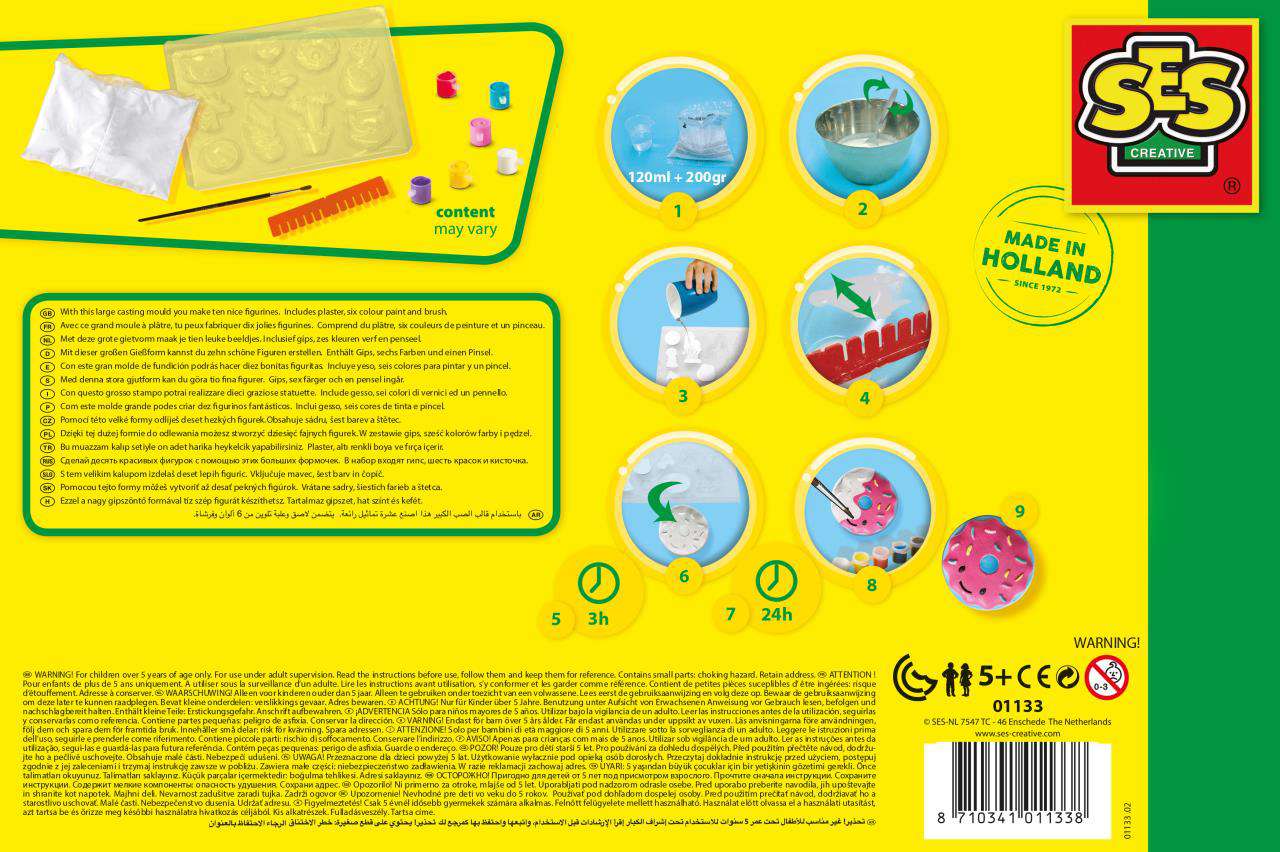 Matrițele detaliate oferă rezultate fantastice, iar ipsosul se usuca rapid. Picteaza cele mai frumoase figurine cu acuarelele incluse in set. Instrucțiunile pot fi găsite pe verso-ul ambalajului. Vopseaua și ipsosul se spală ușor de pe textile și de pe piele.