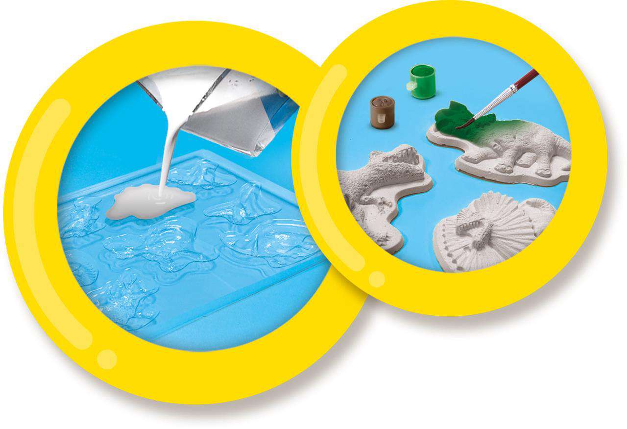 Acest set este special creat pentru toți fanii dinozaurilor! Poți realiza cu ușurință nouă dinozauri diferiți amestecând pudra pentru modelare cu apă și turnând-o în matrita. De îndată ce ipsosul s-a întărit, poți începe să pictezi dinozaurul cu acuarelele incluse. Matrițele detaliate oferă rezultate fantastice, iar ipsosul se usuca rapid. Vopseaua și ipsosul se spală ușor de pe textile și de pe piele.