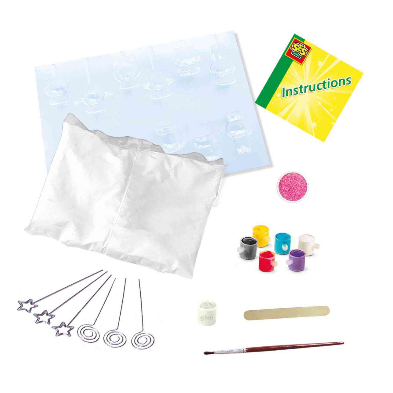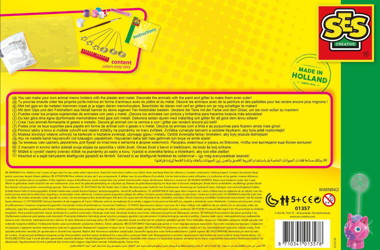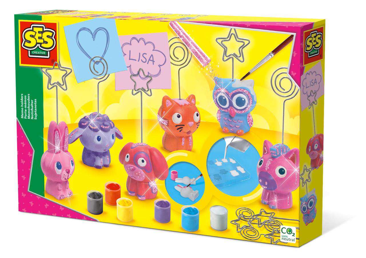 SES prezintă o modalitate fantastică și neobișnuită prin care copiii pot deveni creativi. Cu acest kit distractiv și ușor de utilizat, începe prin a realiza formele de ipsos, turnând amestecul in matrițele din plastic, apoi adauga suporturile metalice. După ce s-au întărit și uscat, lipeste-le una de alta si apoi pictează modelele așa cum îți place, folosind vopselele incluse. O modalitate excelentă de a dezvolta creativitatea, concentrarea și abilitățile motorii fine. Poti astfel realiza cele mai frumoase suporturi pentru notite sau pentru poze pe care le poti expune in camera ta!