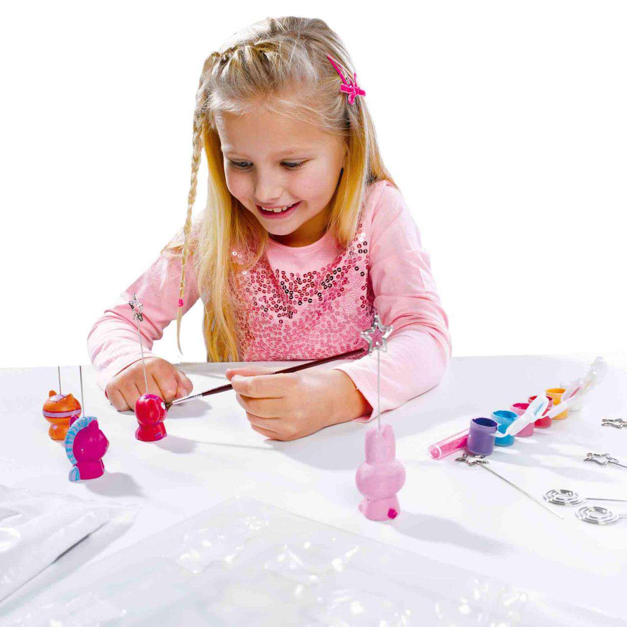 Setul include: 1 tavă pentru turnarea ipososului in forme, 6 recipiente de vopsea, 1 pensulă, 1 pachet cu ipsos, unealta pentru netezire, lipici, sclipici roz, suporturi metalice, instructiuni