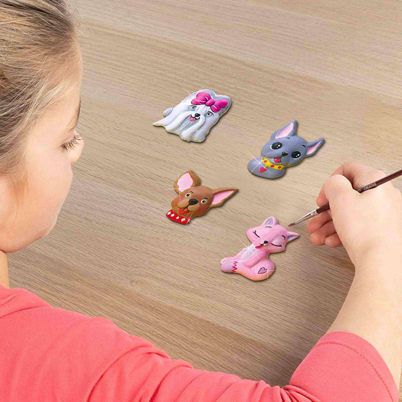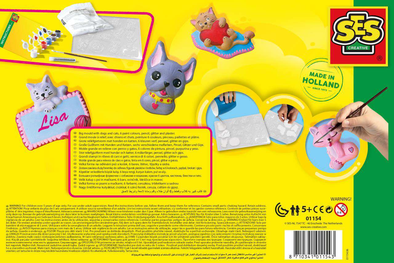 Matrițele detaliate oferă rezultate fantastice, iar ipsosul se usuca rapid. Picteaza cele mai frumoase figurinecu caini si pisici cu acuarelele incluse in set. Instrucțiunile pot fi găsite pe verso-ul ambalajului. Vopseaua și ipsosul se spală ușor de pe textile și de pe piele.