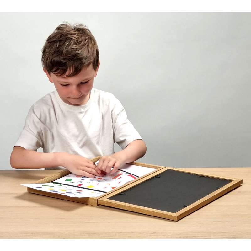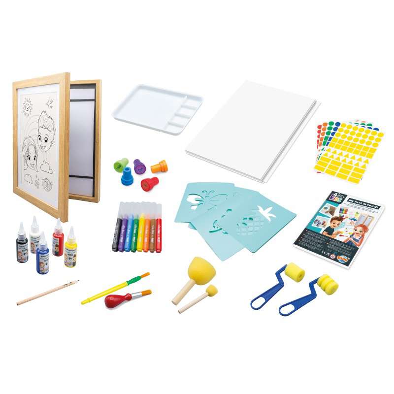 Un set de desen cu rama inclusa pentru depozitarea și afișarea lucrărilor de artă ale copiilor. Rama poate tine si stoca pana la 50 de desene. Poate fi atarnata pe perete sau asezata pe o piesa de mobilier. Cu materialele puse la dispoziție, copiii pot desena, picta și lipi autocolante pentru a-și dezvolta creativitatea și motricitatea fină.