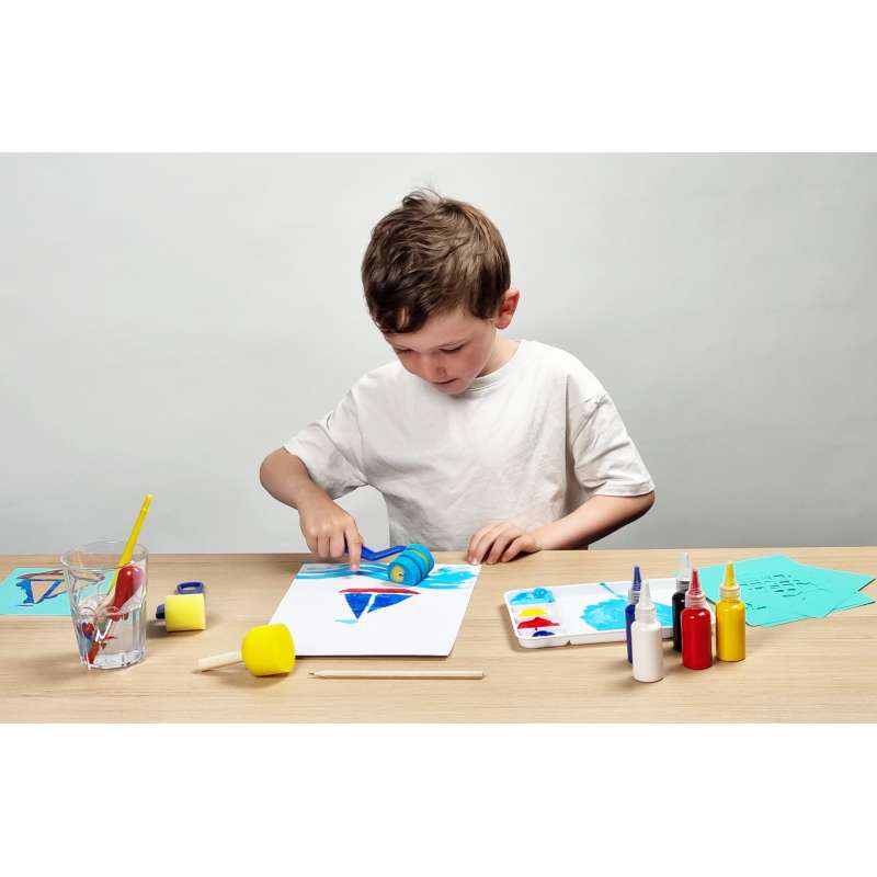 Contine: 1 rama A4, 8 markere cu vârf rotund, 5 ștampile, 5 recipiente cu vopsea, 1 paletă, 2 role de spumă, 2 ștampile de spumă, 2 pensule, 5 șabloane, 5 foi de autocolante, 10 coli de hârtie A4 de 200 g, instrucțiuni cu ilustrații color.