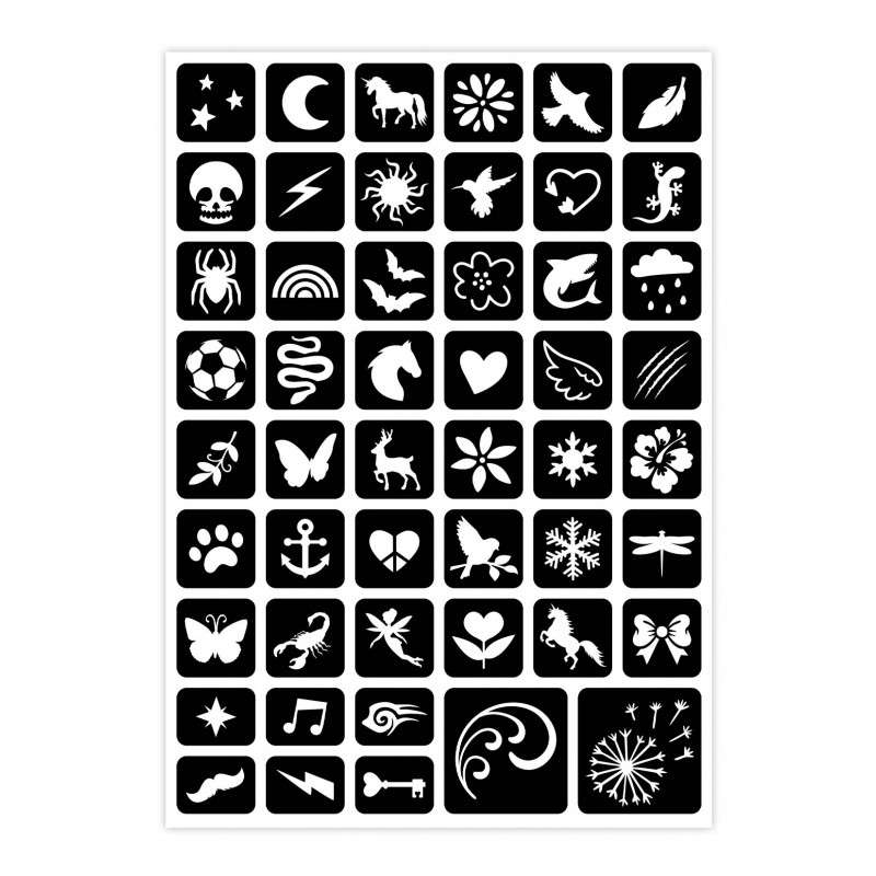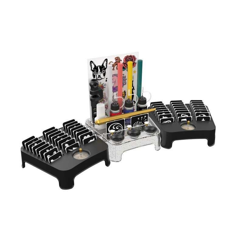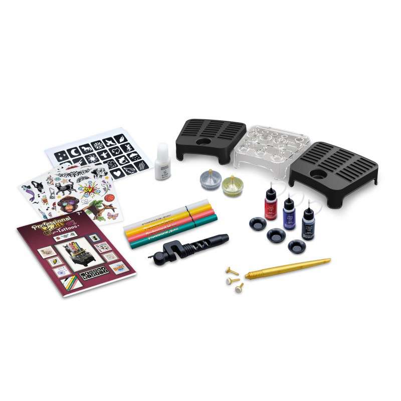 Contine: 4 stilouri pentru tatuaje, 3 cerneluri pentru tatuaje, 4 foi de tatuaje temporare, 2 recipiente cu sclipici, 1 flacon de adeziv cosmetic și 50 de șabloane autoadezive și instrucțiuni cu ilustrații color.