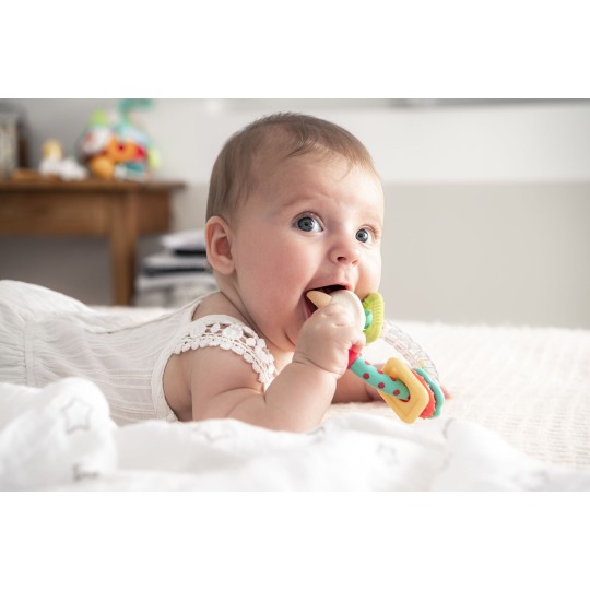 Culorile vii atrag privirea bebelusului, materialele cu texturi diferite, moi sau mai dure, sunt potrivite pentru a masa gingiile dureroase ale bebelusului. Patru forme geometrice diferite si bilutele din interiorul inelului gingival zornaie atunci cand bebelusul le agita. Usor de tinut in manuta, datorita formei speciale. Produsul este ambalat intr-o cutie de carton.